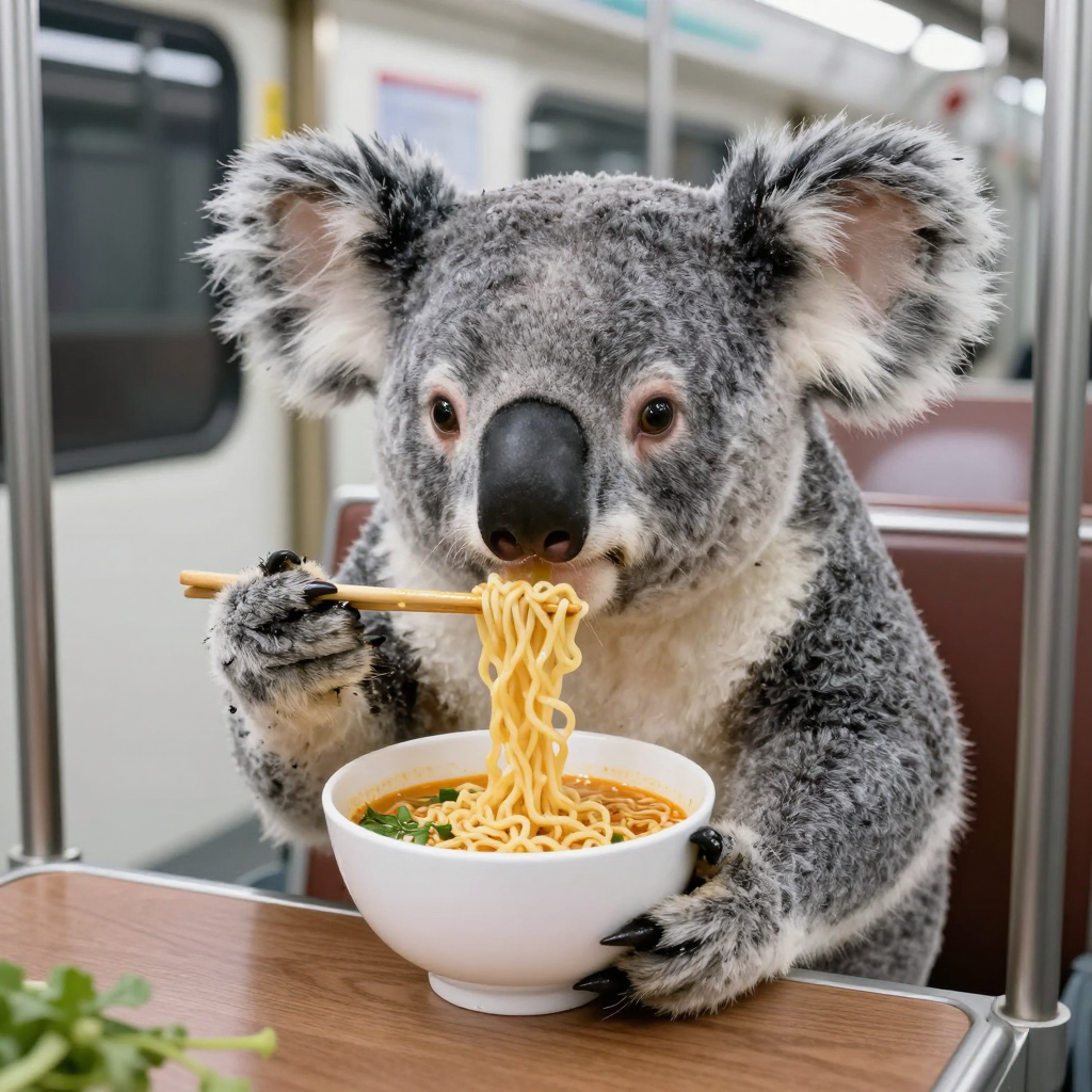 지하철에서 라면 먹는 코알라 - AI Image 128 | ImageGen