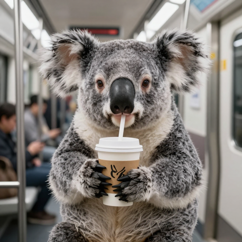 지하철에서 커피 먹는 코알라 - AI Image 130 | ImageGen