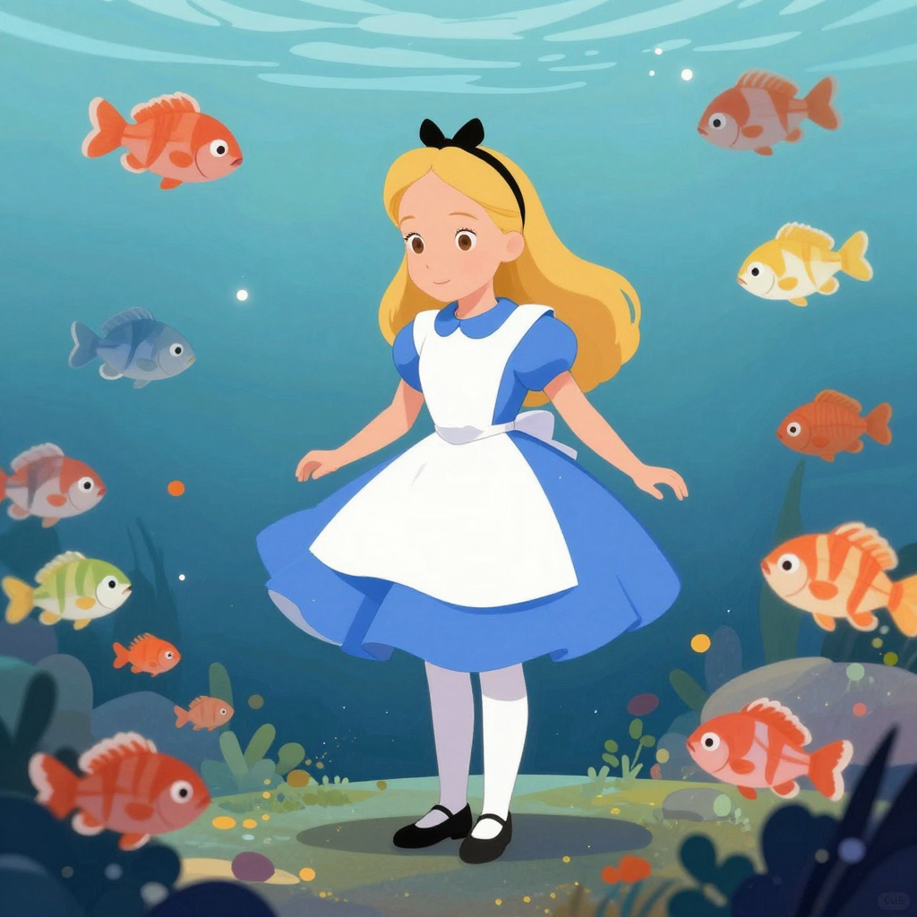 물고기들과 함께하는 앨리스 스타일의 수중 티타임 - AI Image 201 | ImageGen