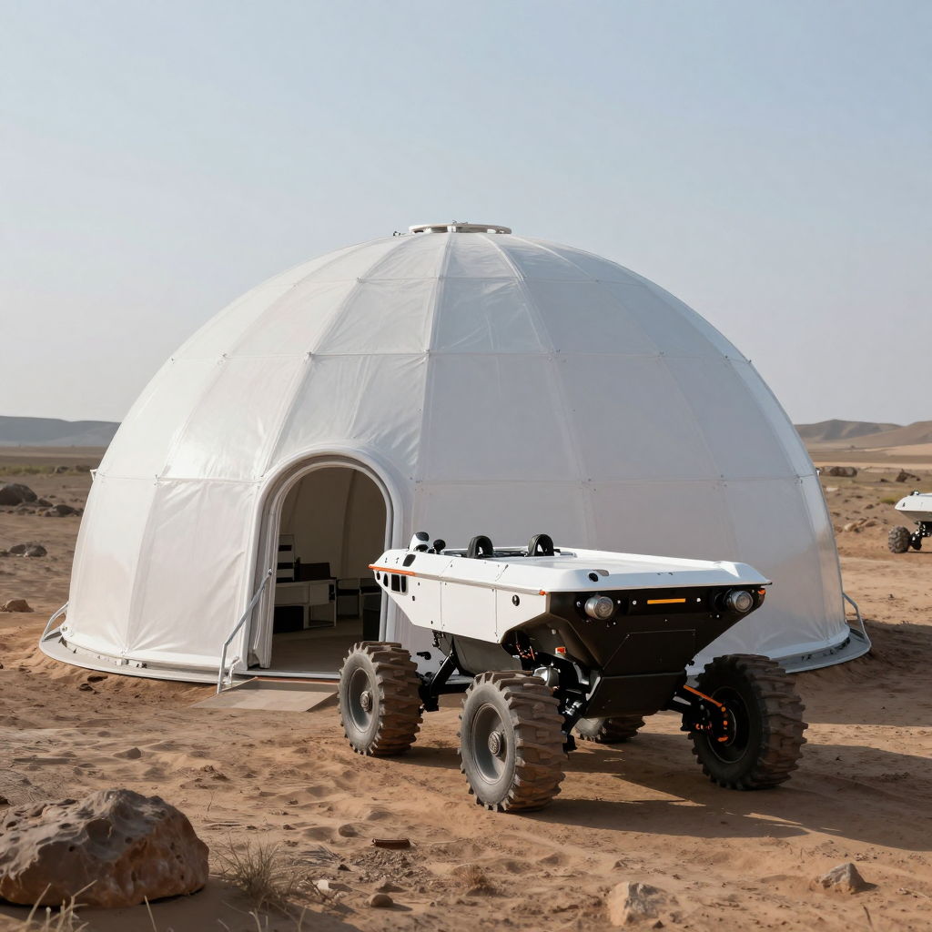 화성 식민지의 돔 형태 거주지와 로버