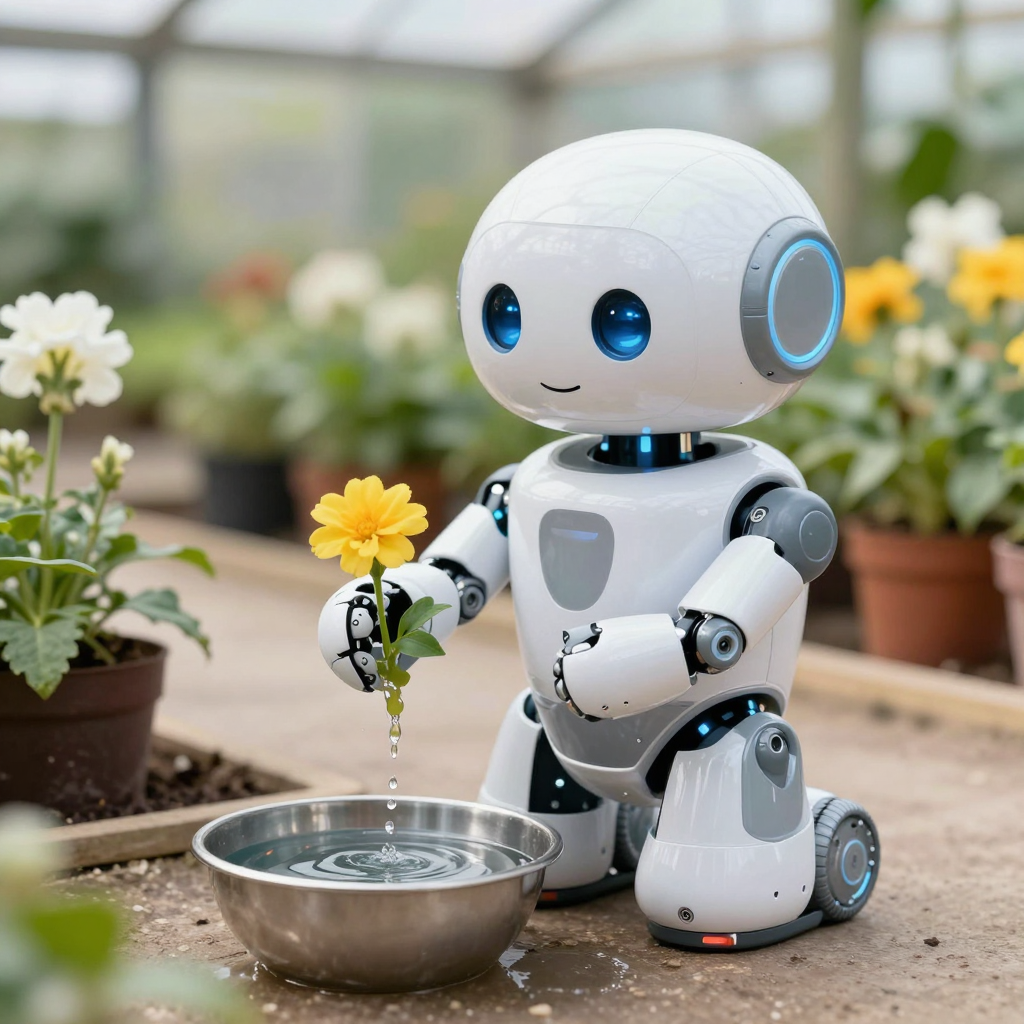 온실에서 화분에 물을 주는 귀여운 로봇 - AI Image 224 | ImageGen
