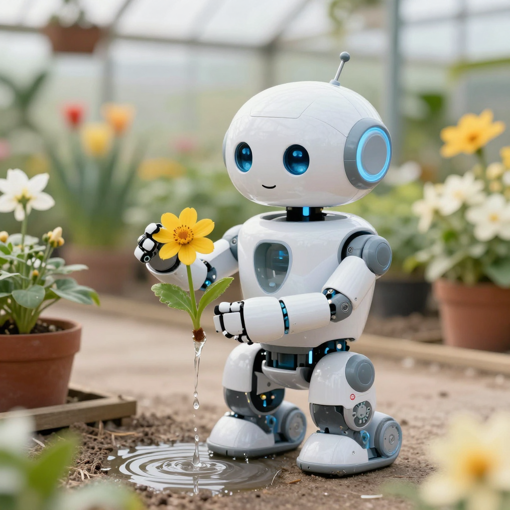 온실에서 화분에 물을 주는 귀여운 로봇 - AI Image 225 | ImageGen