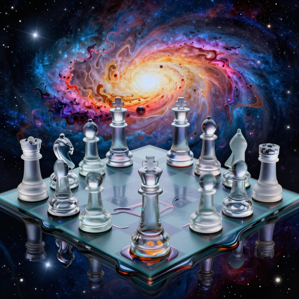 Surrealist composition of a glass chess set melting into a liquid galaxy. Vibrant cosmic colors, nebula background, Salvador Dali inspired, digital art, dreamlike quality, intricate patterns, fluid simulation, masterpiece, ethereal.