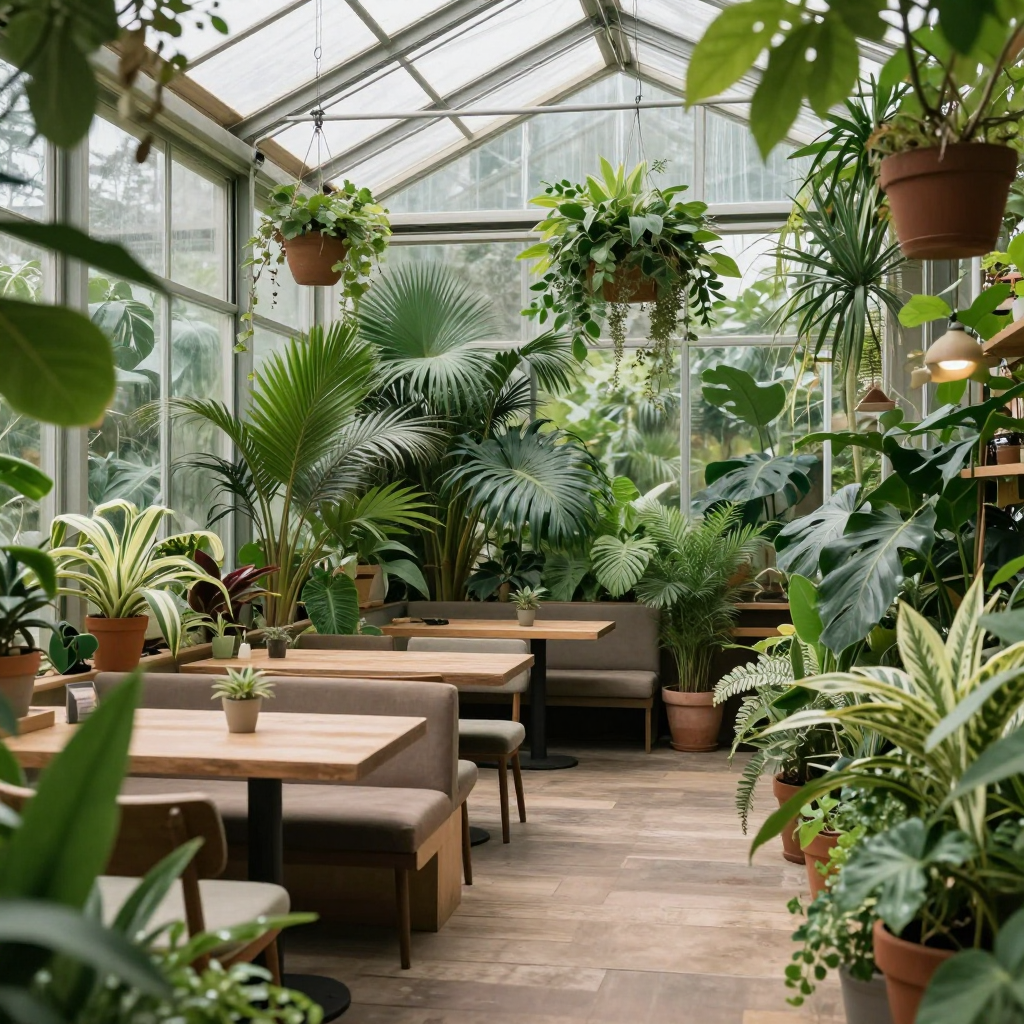 식물로 가득 찬 유리 온실 카페 - AI Image 323 | ImageGen