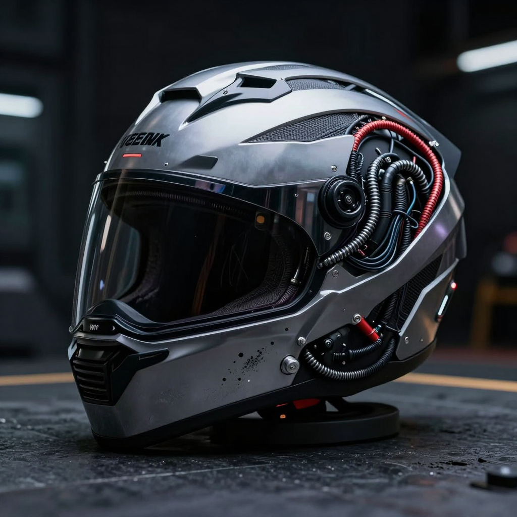 복잡한 전선이 연결된 사이버펑크 오토바이 헬멧