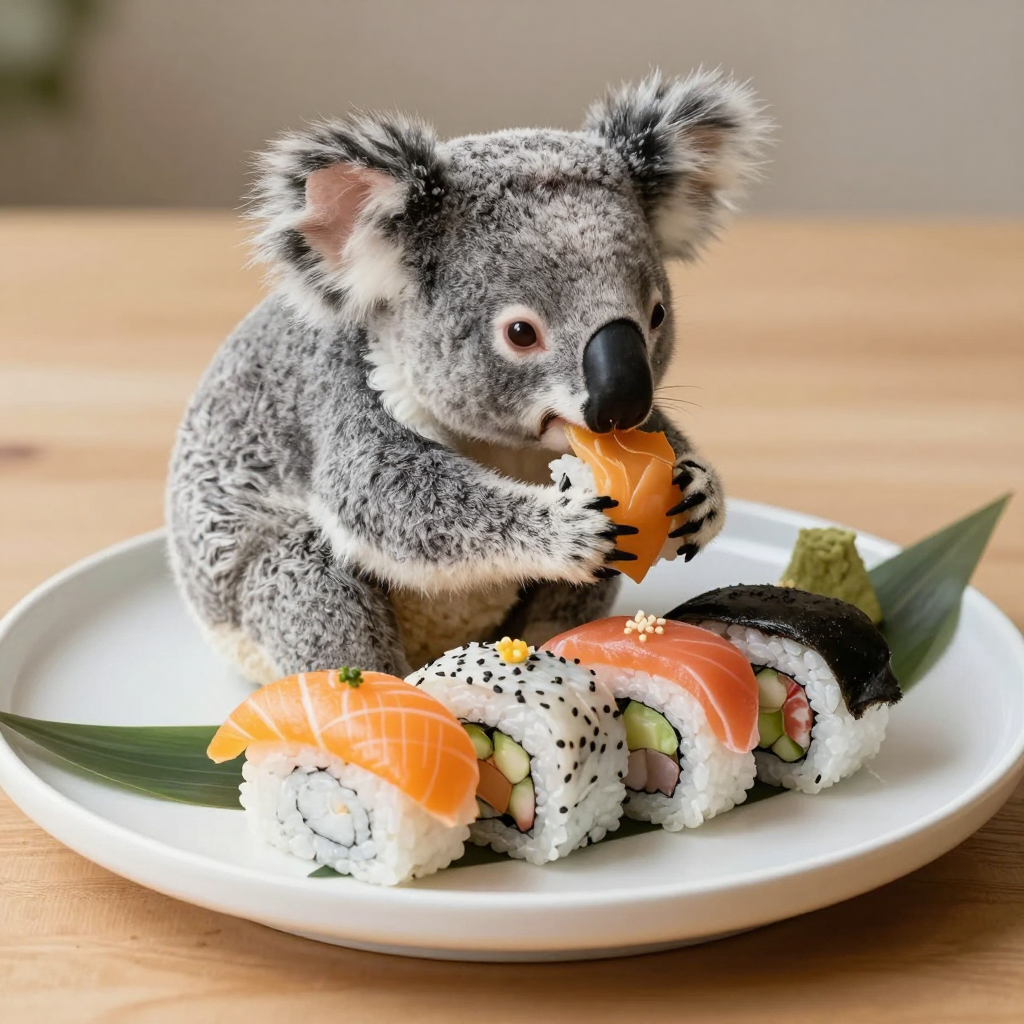 고급스러운 접시에 담긴 형형색색의 초밥 세트를 먹는 코알라 - AI Image 336 | ImageGen
