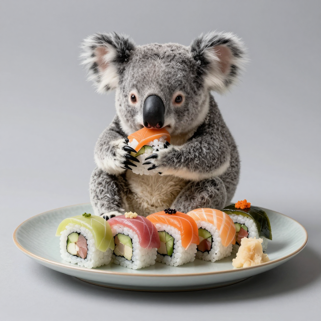 고급스러운 접시에 담긴 형형색색의 초밥 세트를 먹는 코알라 - AI Image 337 | ImageGen