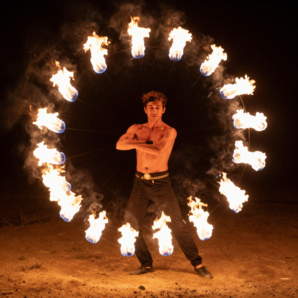장노출로 촬영한 파이어 댄서의 불꽃 궤적 - AI Image 353 | ImageGen