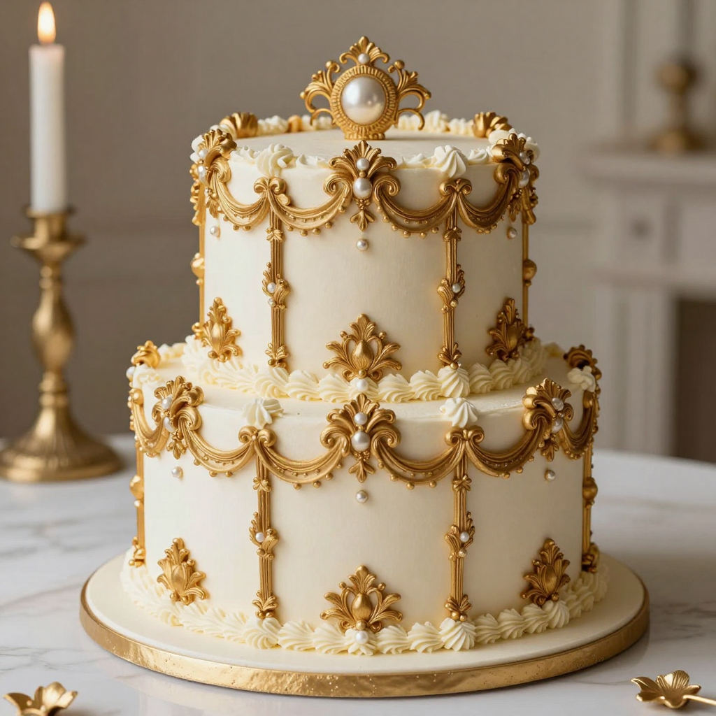금박 장식이 올라간 화려한 로코코 스타일 케이크 - AI Image 364 | ImageGen
