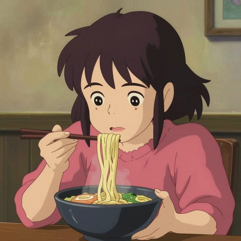 김이 모락모락 나는 지브리 스타일의 라멘을 먹는 소녀 - AI Image 375 | ImageGen
