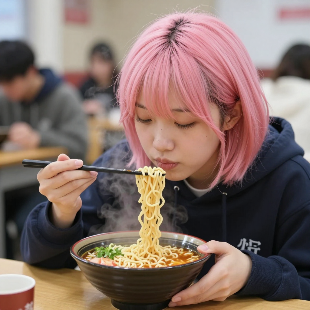 김이 모락모락 나는 실사 스타일의 라멘을 먹는 핑크 머리 대학생 - AI Image 378 | ImageGen