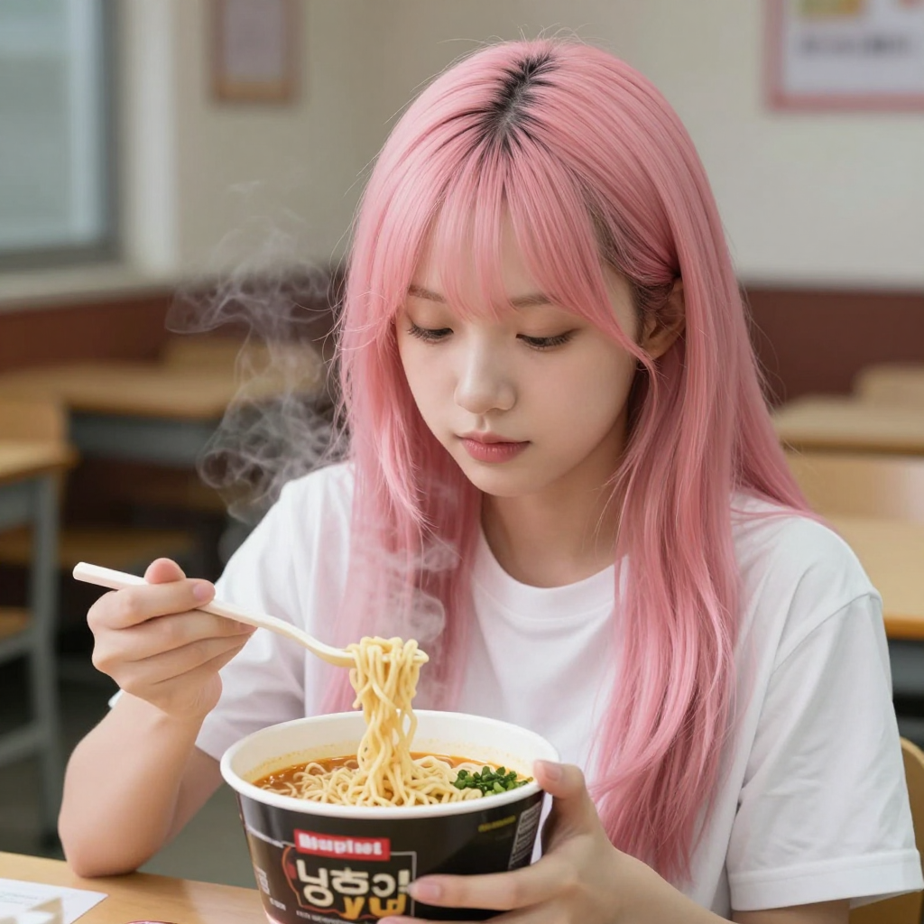 흰색 티셔츠를 입고 김이 모락모락 나는 실사 스타일의 라멘을 먹는 핑크 머리 대학생 - AI Image 379 | ImageGen