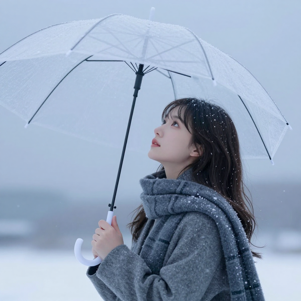 투명 우산을 쓰고 눈내리는 하늘을 보는 소녀 - AI Image 438 | ImageGen