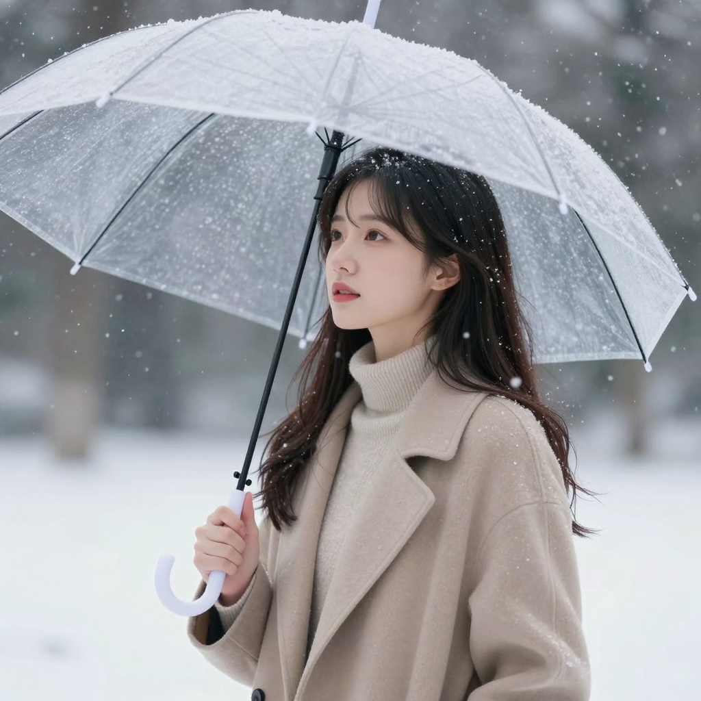 투명 우산을 쓰고 눈내리는 하늘을 보는 소녀 - AI Image 440 | ImageGen