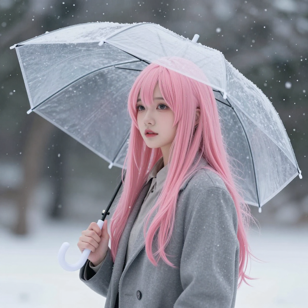 투명 우산을 쓰고 눈내리는 하늘을 보는 핑크 머리 소녀 - AI Image 446 | ImageGen