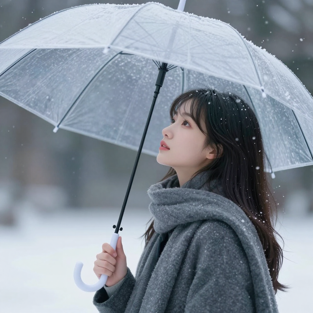 투명 우산을 쓰고 눈내리는 하늘을 보는 머리 소녀 - AI Image 449 | ImageGen