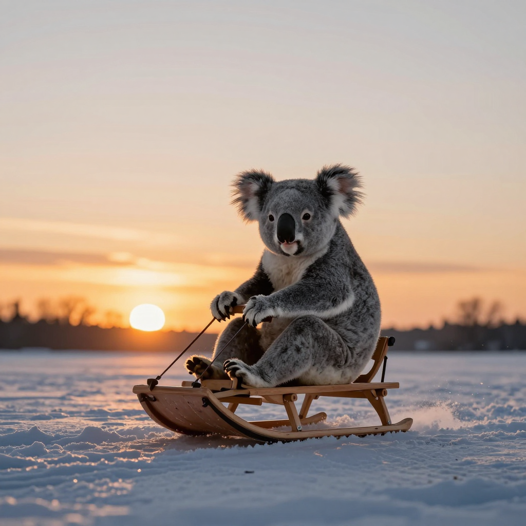 석양을 등지고 눈썰매 타는 코알라 - AI Image 500 | ImageGen