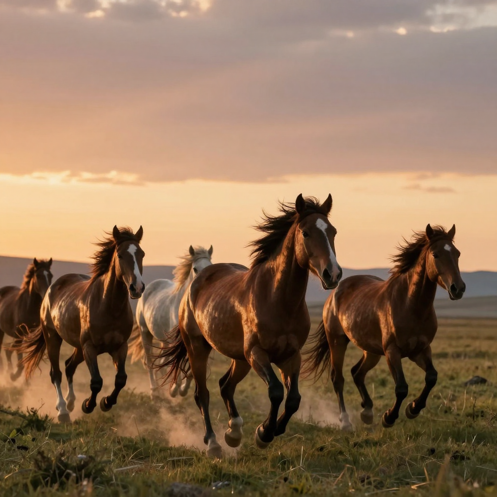 석양을 등지고 달리는 야생 말 무리 - AI Image 509 | ImageGen