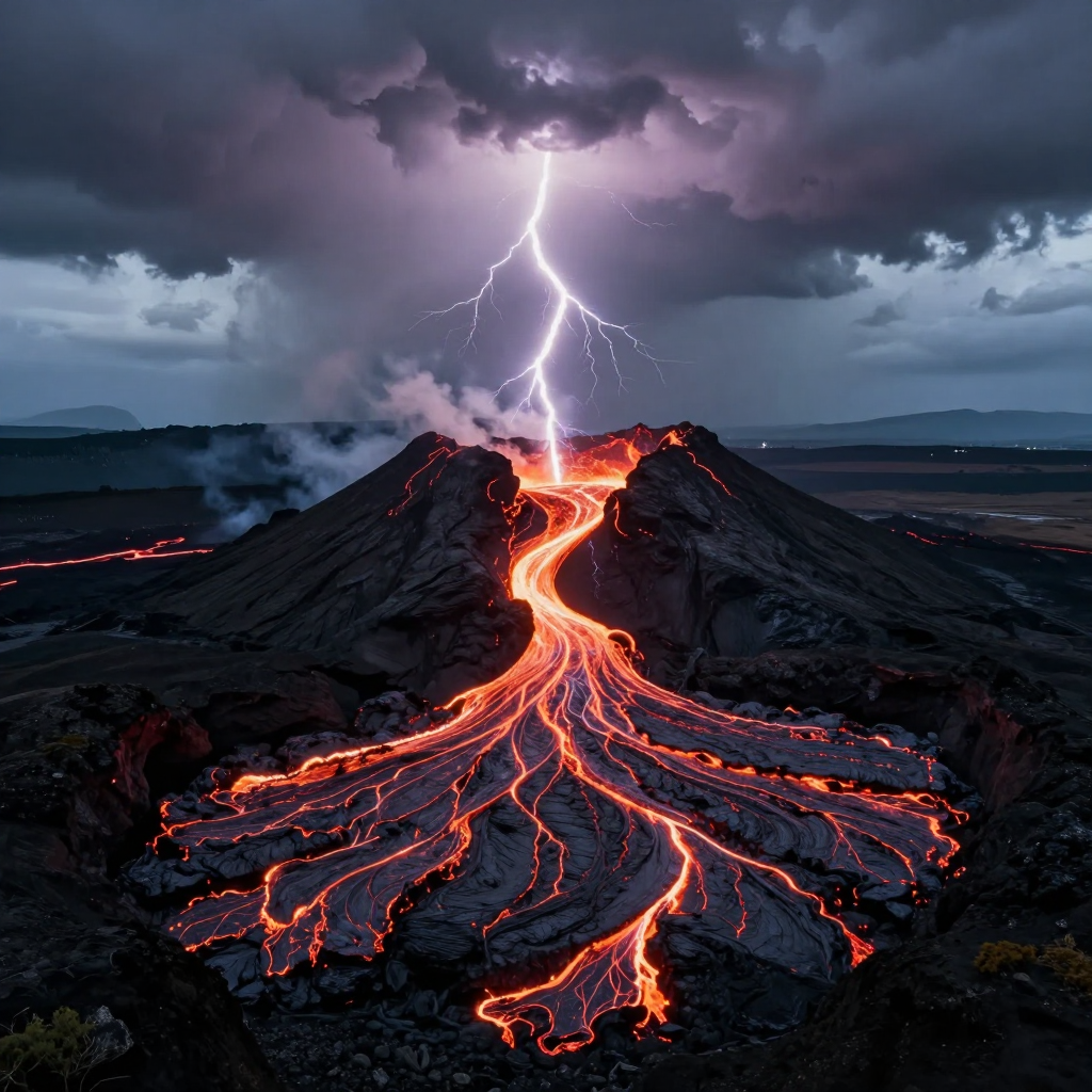 용암이 흐르는 화산 지대와 번개 - AI Image 517 | ImageGen
