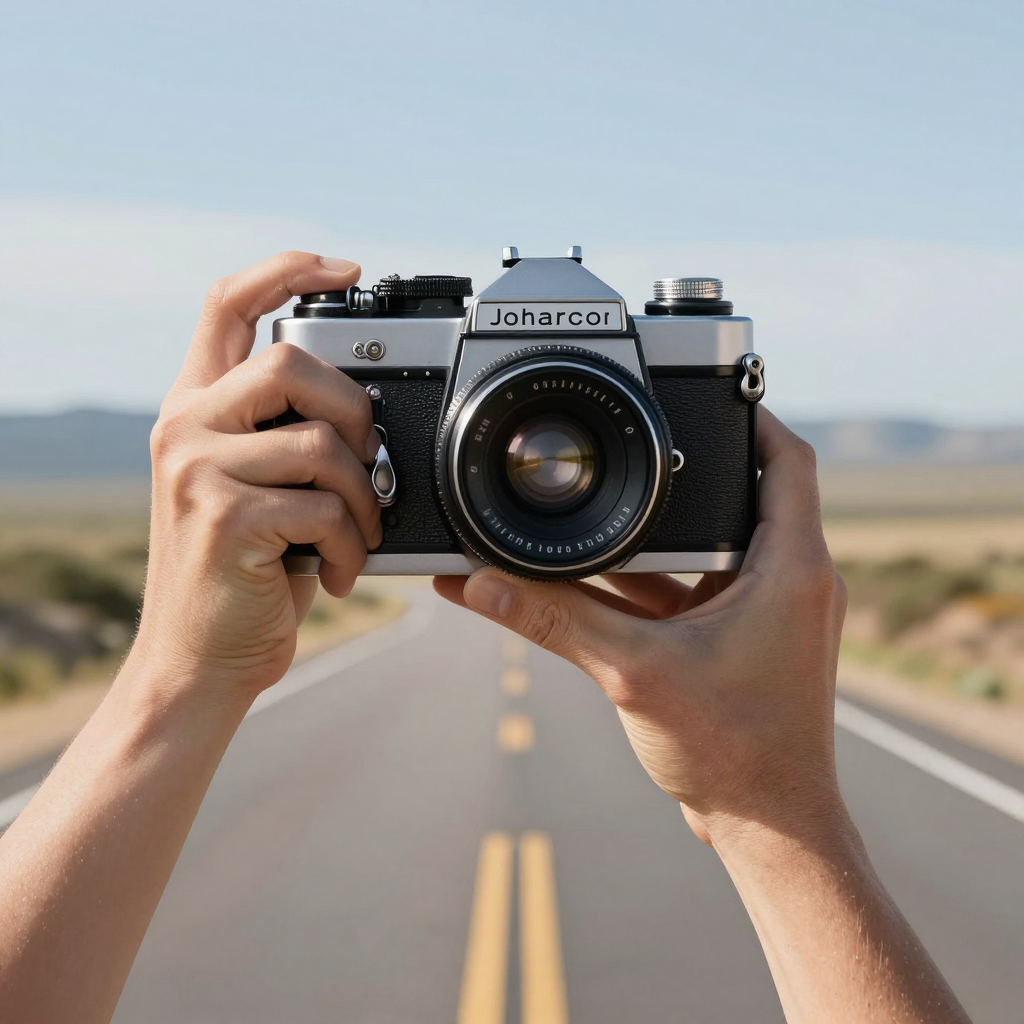 Vintage film camera, 70s American road trip, scenic landscape, highly detailed, sharp focus, well composed, realistic anatomy