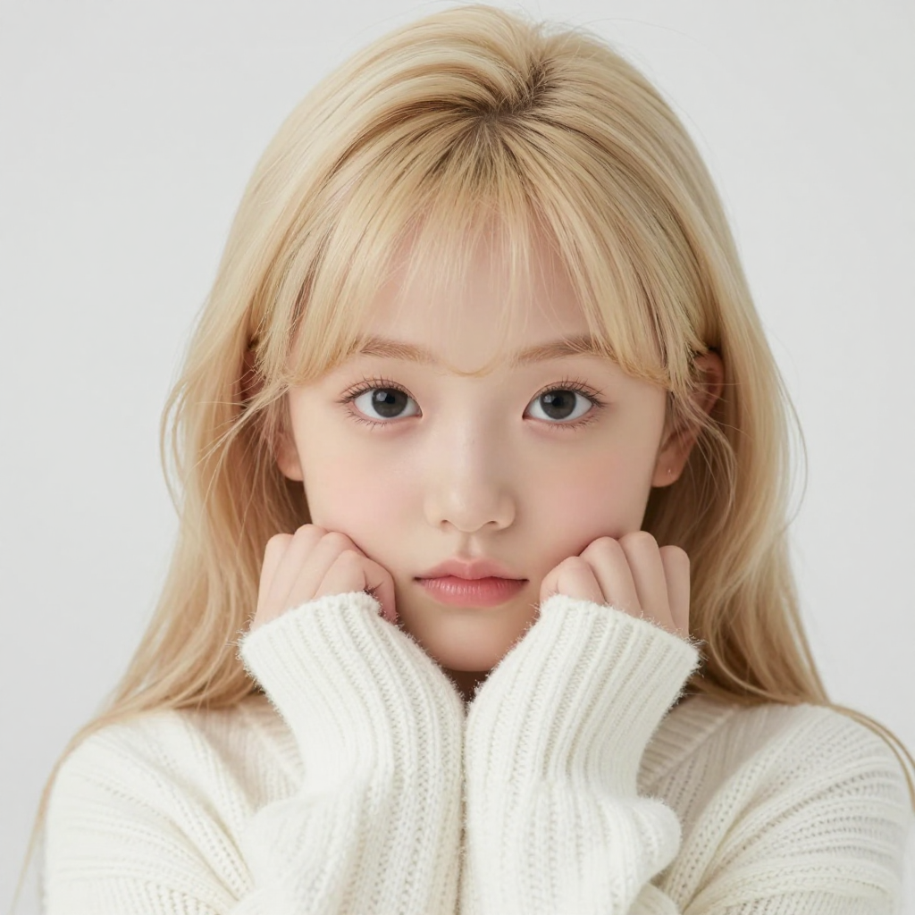 눈을 맞으며 흰색 겨울 스웨터를 입은 금발 긴머리 귀여운 소녀 - AI Image 92 | ImageGen